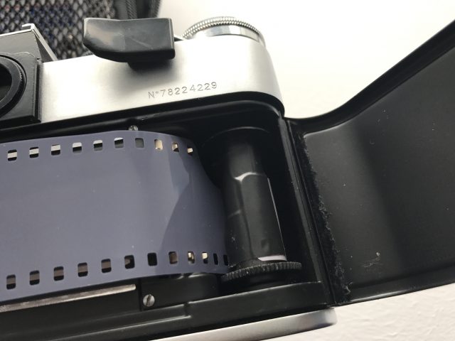 We tried to load a roll of Fuji ACROS Neopan 100 into the Zenit, which was difficult because there was nothing to hook the film to the spooling mechanism. Finally, I glued the film to the spool with a piece of tape and hope for the best.