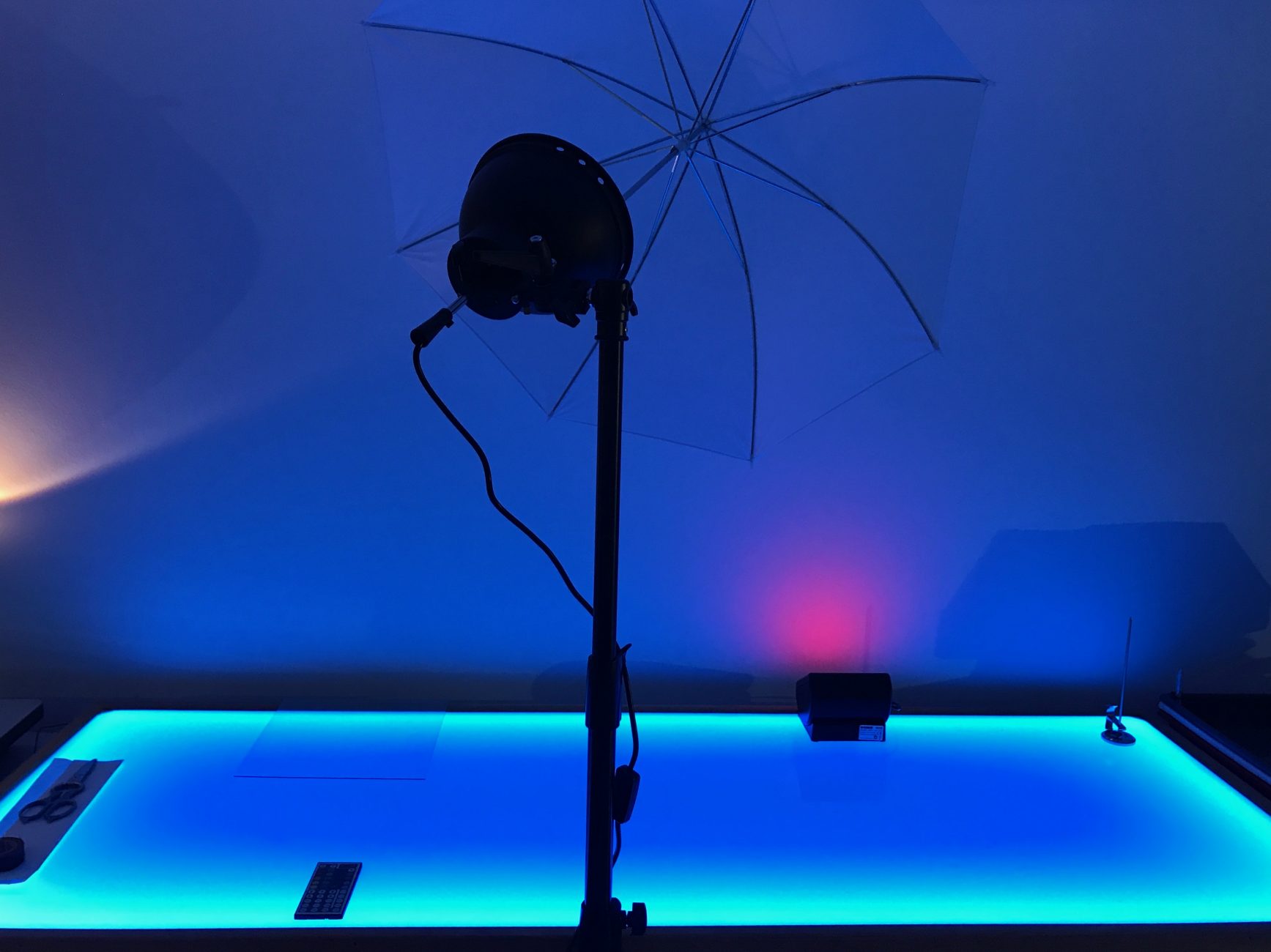 No idea, why the Lino like floor smells like fish but I got everything in, leaving the window open. Since it got quite cold outside and I don’t have a heating it feels fresh and funky right now. I put some lights in the room – looks more warm. Same music like in CYBAR through a Bang & Olufsen Play Beoply A1. Nice – TY for the music DJ BoYoung! Finally, I got our first temporary working place ready. Just the window shading is missing – thats easy – its very small and I plan to work mostly when its dark anyways. The door is supposed to come on Saturday – almost ready – lets take a look: